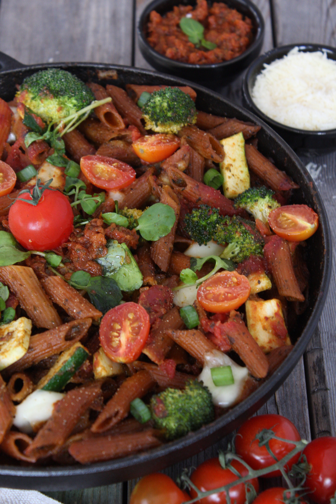 Delicious Red Lentil Pasta, tossed with rich sun-dried tomato pesto and veggies, and topped with vegan mozzarella — it makes a nutritious, comforting and healthy dinner.