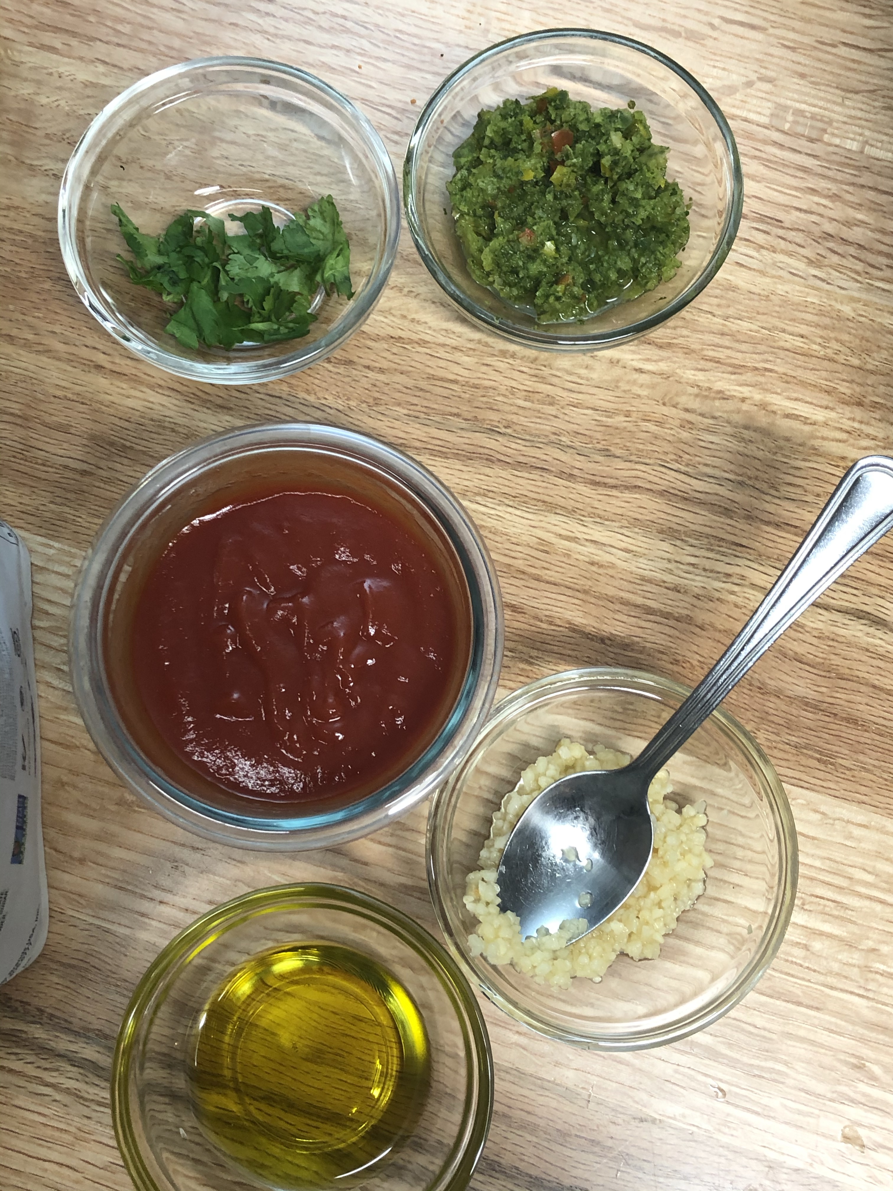 Cilantro, sofrito, tomato sauce, olive oil and garlic.