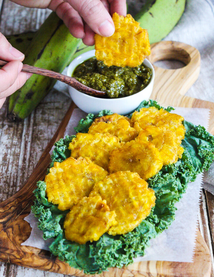 For us Puerto Ricans is like frying potatoes, we cook them almost every day. People like to eat them with some salt sprinkled on top or different kind of dipping sauces like “mayo ketchup” which is a mix of mayonnaise and ketchup. Some people hate “mayo ketchup’’ others can’t live without it. I love to eat them naturally without salt, but I also love a dipping sauce. For these tostones I use a store brought garlic pesto. I didn’t make my own because I couldn’t find fresh basil at the supermarket.