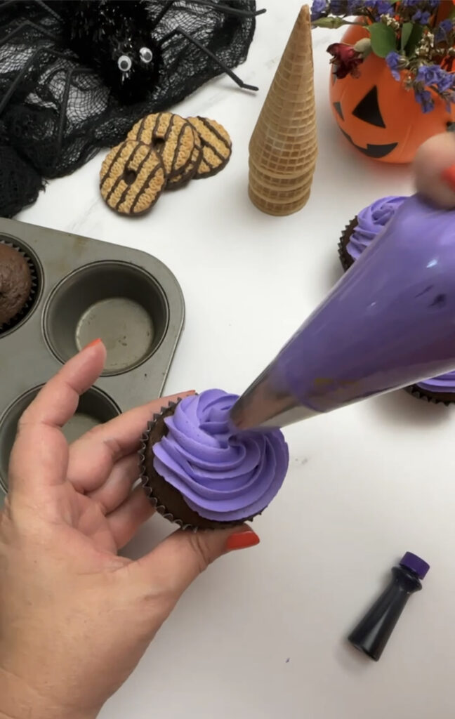 Use purple buttercream to frost cupcakes using decorating tip #2D, set aside.