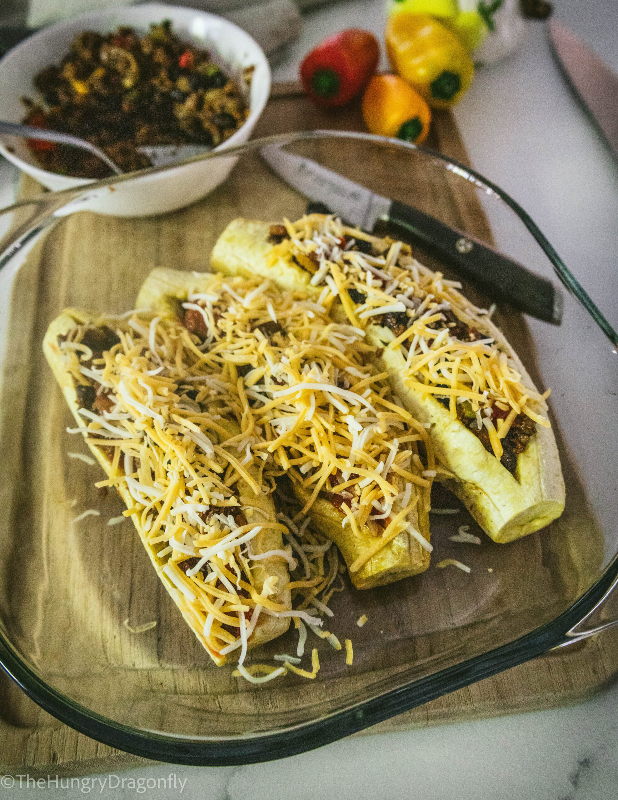 - Fill each plantain "canoe" with the beefless mixture. If using vegan cheese, sprinkle it on top of the filling.