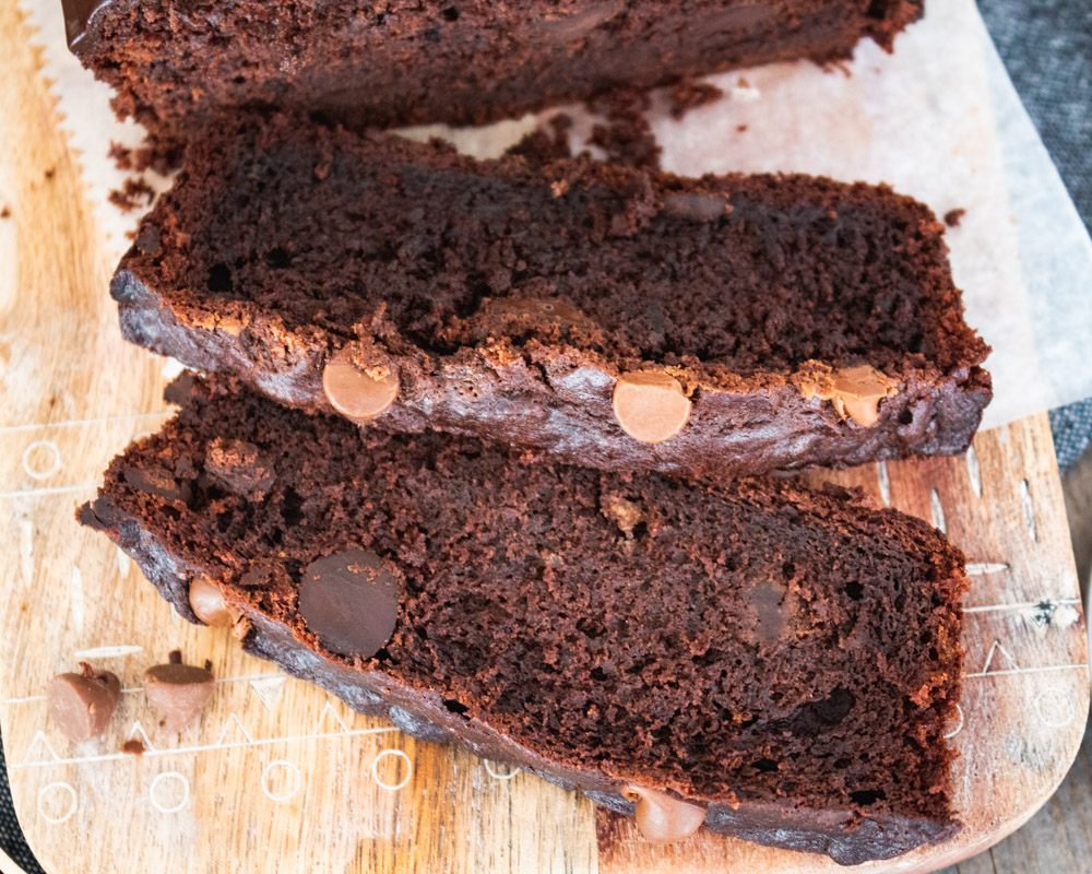Bake for 50-60 minutes, or until a toothpick inserted into the center of the bread comes out mostly clean. Because of the chocolate chips inside the cake you might have some melted chocolate chips on the toothpick, that’s okay.