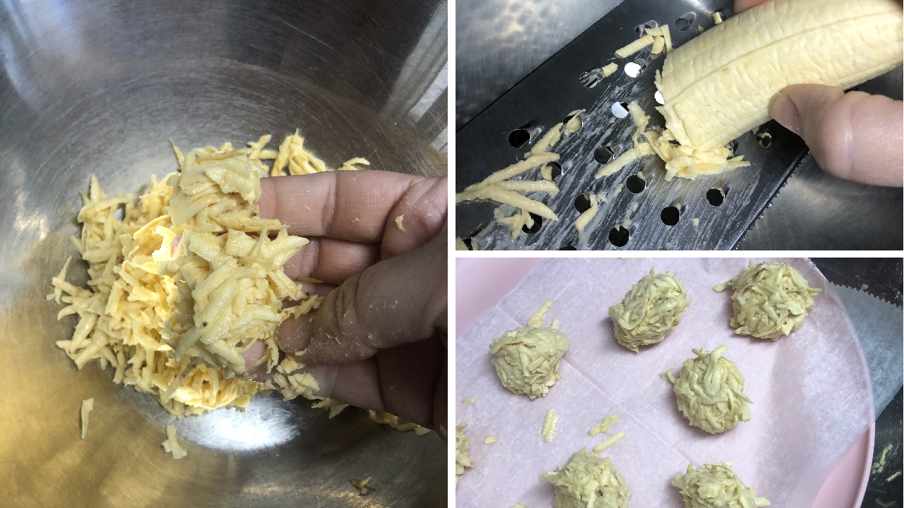 Firstly, for my Asopao de Gandules Vegano I like adding bolitas de platano or “plantain dumplings”. Secondly, the plantain dumplings or bolitas de platanos are easy to make. For making bolitas de platano you can chop the plantain into tiny pieces and shred it in a food processor, but I prefer a hand shredder. See the picture and video for more details.